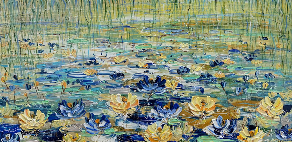 Velia Newman’s Lilypond series is a serene and vibrant celebration of nature, capturing the delicate beauty of still waters, floating lily pads, and the gentle presence of dragonflies. Using her signature palette knife technique, Velia layers rich, thick paint to create depth and texture, bringing each scene to life with movement and colour. The interplay of light on water, the softness of blooming lilies, and the glimmer of dragonfly wings evoke a sense of calm and wonder, making each piece a peaceful escape into nature’s quiet magic.